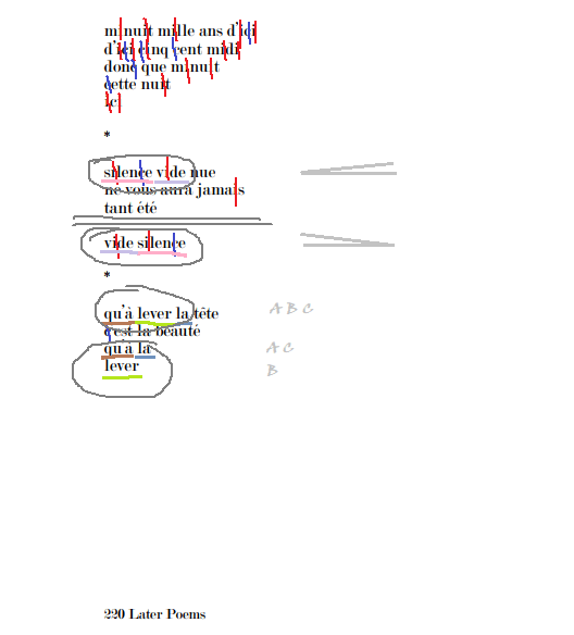 The assignment for Disquiet Junto 0449 was to read a page of text from a book as if it were a musical score. My score for this piece is page 220, the last page of Mirlitonnades, in The Collected Poems of Samuel Beckett, edited by Seán Lawlor and John Pilling, New York: Grove Press, 2012. This page contains three poems, which are separated by asterisks. I read this page as a score of a composition in three movements. The first part is full of i-s and c-s, which I interpreted as two different percussive sounds. The frequency of these two letters is decreasing significantly in part two and in part three there is only one c. The frequency of these two letters is so high in part one that I decided that the first movement will have the two percussive sounds only. Part two is characterized am overall circle structure. The beginning phrase “silence vide” recurs at the end, but in retrograde form: “vide silence”. Correspondingly in my piece the same sound moves from simple to complex at the beginning and from complex to simple at the end of part two. The blank line before the last one I interpreted as a caesura which corresponds with a rest in the music. The i-s and the c-s are still the two different percussive sounds from part one. The final part again has a circular structure with three words at the beginning which recur at the end, but in different order. I assigned a different musical element to each the three words.